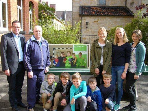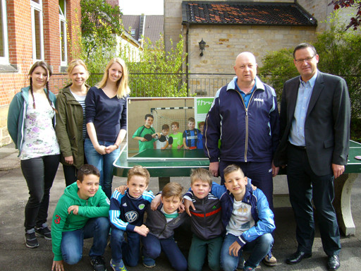 Die Siegermannschaften der 3. und 4.ten Klassen erhielten als Preis einen Mini- TT- Tisch mit dem Bild des Siegerteams. Bei den 3ten und 4ten Klassen gewann die GS St. Ludgeri, denen der Tisch übergeben wurde.